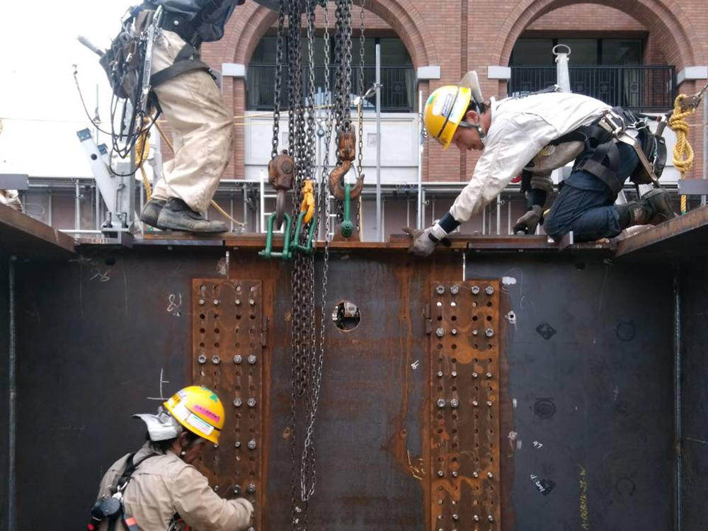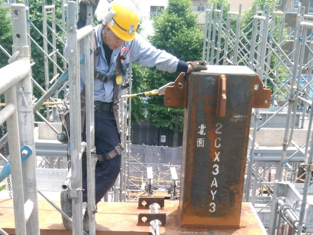 部材の現場搬入から図面に従った柱梁の組立、検査・修正作業、そして最終的なボルト固定まで、我々の技術とノウハウにより一貫して対応します。